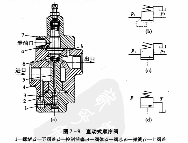 若將下閥蓋2相對于閥體轉(zhuǎn)過90°或180°,將螺堵1拆下,在該處接控制油管并通入控制油,則閥的啟閉便由外供控制油控制。這時即成為液控順序闊,其圖形符號如圖7 -9(c)所示。若再將上閥蓋7轉(zhuǎn)過1800,使泄油口處的小孔α與閥體上的小孔b連通,將泄油口用螺堵封住,并使順序闊的出油口與油箱連通,則順序間就成為卸荷閥己其泄漏油可由闊的出油口流回油箱,這種連接方式稱為內(nèi)泄。卸荷闊的圖形符號如圖7 - 9 (d)所示。