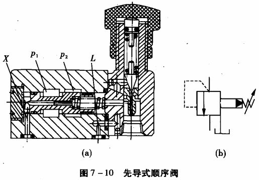 先導式順序閥與直動式順序閥一樣也有內(nèi)控外泄、外控外泄和外控內(nèi)泄的控制方式,圖7-lO(a)所示為先導式順序闊的結構原理圖,圖7 -10Cb)為內(nèi)控外泄式先導順序閥的圖形 符號。